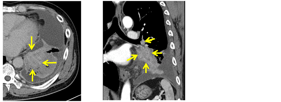 As a palliative therapy, we performed IPHHC after a pneumonoectomy for the advanced pulmonary angiosarcoma with malignant effusion. In cases of advanced lung cancer with malignant effusion, to control the pleural effusion and to preserve the patient’s better quality of life, we sometimes performed a traditional intrapleural hyperthermic chemotherapy (IPHC) as a palliative therapy [3] [4] . Regarding the IPHHC therapy, there have been no previous reports. For the traditional IPHC treatment, there is also no appropriate clinical trial for the tumor response rate and overall survival. This time, the new IPHHC was our first clinical practice for tho- racic malignant diseases involving of pulmonary angiosarcoma.