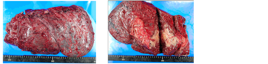 As a palliative therapy, surgical resection with pneumonectomy for the primary pulmonary angiosarcoma and intrapleural hypotonic hyperthermic chemotherapy (IPHHC) were scheduled. The patient signed an informed consent. In November 2010, under general anesthesia, one-lung ventilation, after the left open thoracotomy at the 5th intercostal space, the intraoperative cytology of pleural effusion resulted in a negative malignancy findings. Prompt intraoperative pathological examination showed a positive malignancy at the edge of the bronchial stump and disclosed tumor-cell-invasions of the pericardial fat tissue and pleura. The picking-up of mediastinal lymph nodes (station #8) showed a positive metastasis (N2+, pT3N2M1a, p-stage IV). Although the patient had suffered small daily discontinuous hemoptysis, we performed a left pneumonectomy to remove the pulmonary tumorous bleeding origin. We performed a blood transfusion of red cell concentrates of mannitol adenine phosphate (4 units) and fresh-frozen plasma (2 units). The specimen showed a pleural dissemination of the surface of the resected lung (Figure 4(A) and Figure 4(B)).