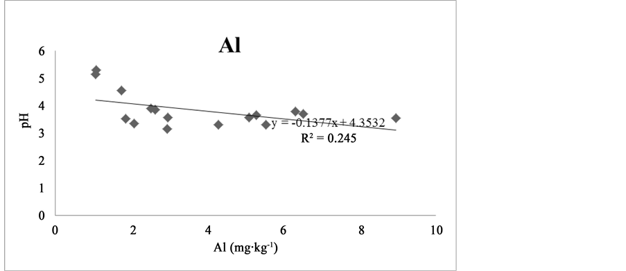 samples, with values ranging from 37 to 198 mg/kg. Fe is more acidic than that of Al; hence, its presence results in lower pH.