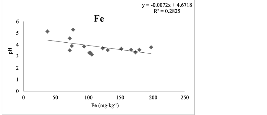 The pH of the silted deposits was also negatively correlated with the extractable Fe and the relationship was given by the equation Y = −0.0072x + 4.6718 (R2 = 0.2825). Like Al, Fe had undergone hydrolysis in the presence of water [20] :