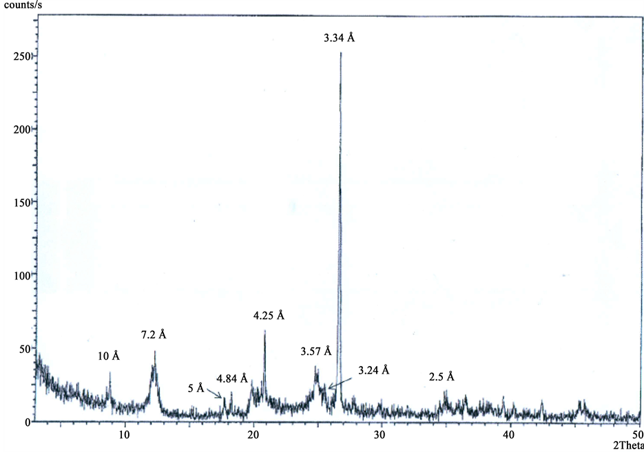 Samples for XRD analysis were not chemically treated as we wanted to identify the mineralogical composition of the silted sediments as they were. Small amounts of the air-dried silted sediments were taken from the bulk samples and immediately X-rayed using Philips PW 3440/60 X’Pert PRO available at the Department of Land Management, Faculty of Agriculture, Universiti Putra Malaysia, Serdang, Malaysia. The minerals present in the silted sediments were identified from diffractograms using d-spacing provided by the book of Shamshuddin [6] .