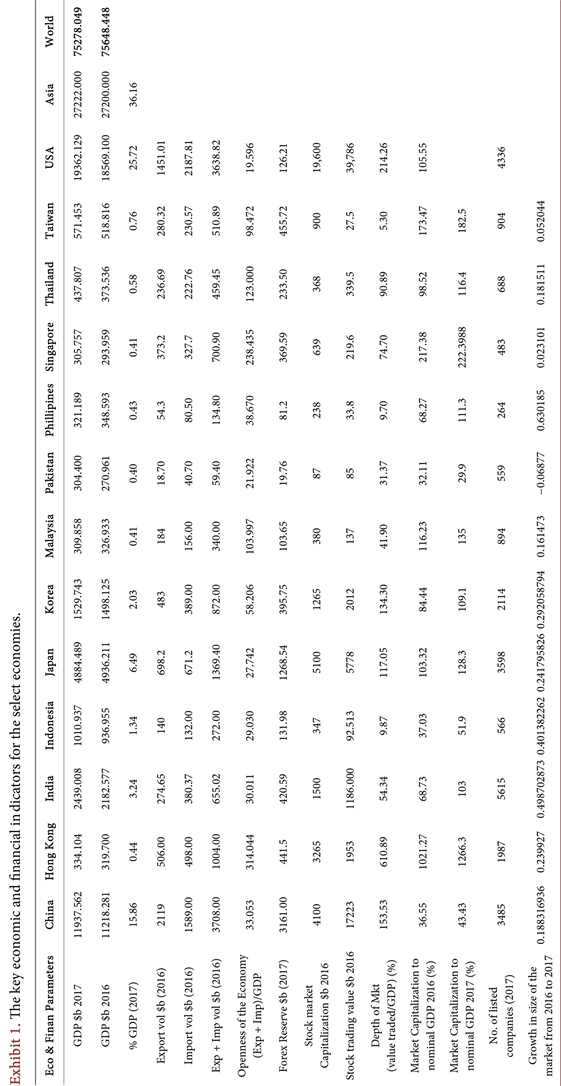 For the study, we select all big Asian economies having GDP of 2017 on PPP basis higher than US$500 billion which resulted into 17 countries. However, two most active Asian Financial markets namely, Hong Kong China and Singapore remain excluded because of relatively smaller size of the economy. Thus to include these two countries we considered economies with minimum US$400 b. All other countries with lower than $400 b GDP values do not have active financial markets, hence are not included. Out of these 19 countries2, we have to drop seven frontier economies (Iran, UAE, Saudi Arabia, Bangladesh, Iraq, Vietnam and Kazakhstan) because of lack of availability of data. As per 2017 data of GDP, the 12 major Asian nations (US$24,386.31 b), available for study, represent approximately 32.4% of world GDP (US$75,278.049 b) and is approximately 90% of the Asia’s total GDP (US$ 27,222 b). The key economic and financial indicators for the select economies are given in Exhibit 1.