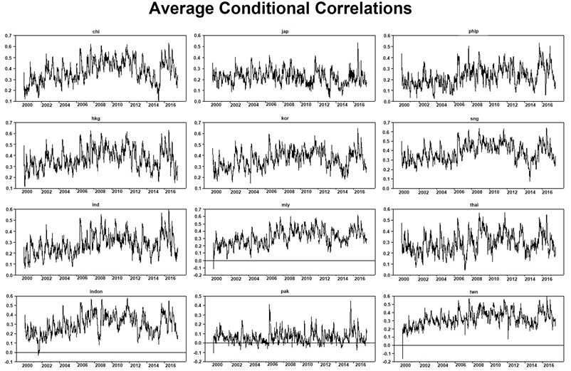 Figure 1. Dynamic conditional correlations of the Asian markets. Notes: (a) The figure depicts dynamic conditional correlations of each Asian market with rest of the sample markets on an average, computed from the ADCC model; (b) chi, hkg, ind, indon, jap, kor, mly, pak, phlp, sng, thai and twn denote Chinese Mainland, Hong Kong China, India, Indonesia, Japan, Korea, Malaysia, Pakistan, Philippines, Singapore, Thailand and Tawan, respectively.