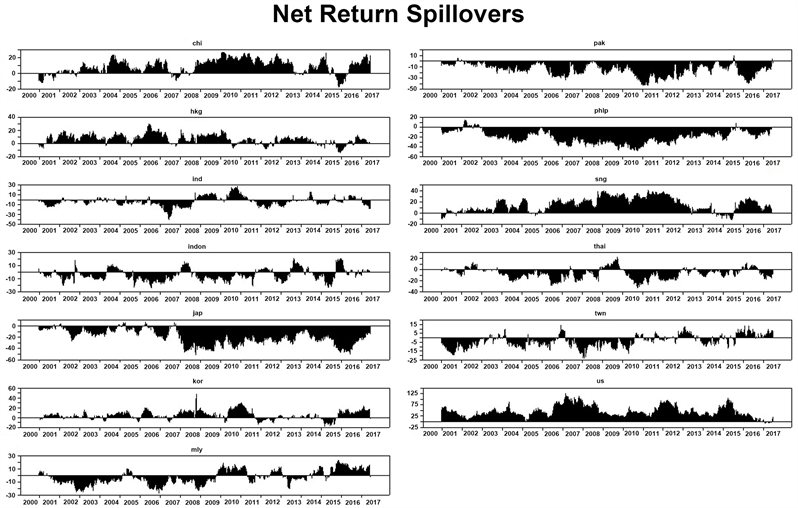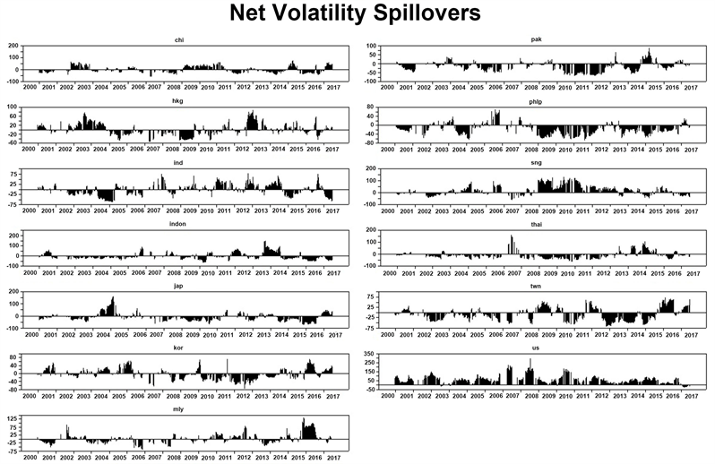 The time series patterns of total volatility spillovers (see Figure 4) among the sample Asian markets indicate that it doubled from 41% to 82% during the period of 2000 to 2016 before coming down to 65% in the last part of the study. The net volatility spillovers (see Figure 5) depict no clear pattern for any