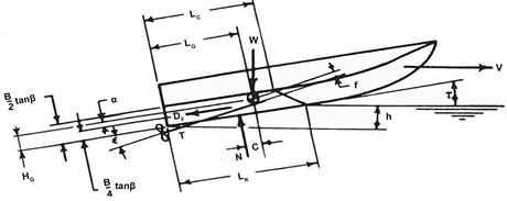 Savitsky in 1964 developed a method of analyzing the hydrodynamic characterization of planning hull vessels. The method is based on the hydrodynamic and hydrostatic forces that act on the hull. Both the drag and lift components of the forces were taken into consideration in his formulations. Figure 2 presents a schematic of a planning craft showing the force parameters and dimensions.