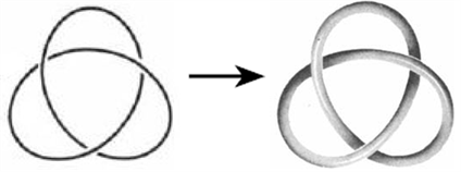 The last application of presenting groups by generators and relations to be discussed in this paper is its role in the branch of knot theory. The strict mathematical definition of knots is a one-dimensional curve situated in ordinary three-dimensional space such that it begins and ends at the same point and does not intersect itself. One way to picture the concept a little more concretely is by thinking of the curve as a looped string―and indeed, hand-tied knots, its diagrams, and even characteristics such as minimum number of crossing points bear a great deal of physical intuition (Figure 4).