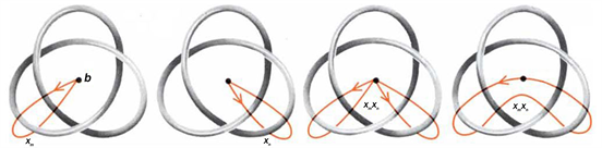 For the convenience in examining such possible pathways, let’s call the three-dimensional space outside a given knot tube S. Let Ω be the set of all directed, one-dimensional paths in S (thus avoiding the knot tube) that begin and end at a fixed point b in S. Point b can be chosen arbitrarily, since the pathways by which a knot group is defined are not altered by the choice of any specific points. The one-dimensionality makes sure that there are no knots on the pathways because any knot will deform to a single point in one-dimensional space. Also, the “trivial” path e that doesn’t leave b is count in Ω as well. Some elements of Ω are illustrated in Figure 6.