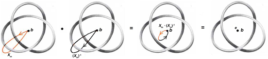 The proof that this above relation is indeed an equivalence relation follows quite trivially from the definition. In fact, such deformations are called homotopies in knot theory, and paths that differ only by homotopies are called homotopic. Hence, Ω is partitioned into equivalence classes where denotes the set of all elements in Ω homotopic to path . Then, in the same manner as free groups were defined in section 3.1, we can define the underlying set of the knot group as the set of all equivalence classes in Ω and its group operation as where represents the path from point b that first follows back to b and then follows back to b. As illustrated in Figure 7, and is well-defined. Hence, the set of all equivalence classes in Ω is closed under this operation.