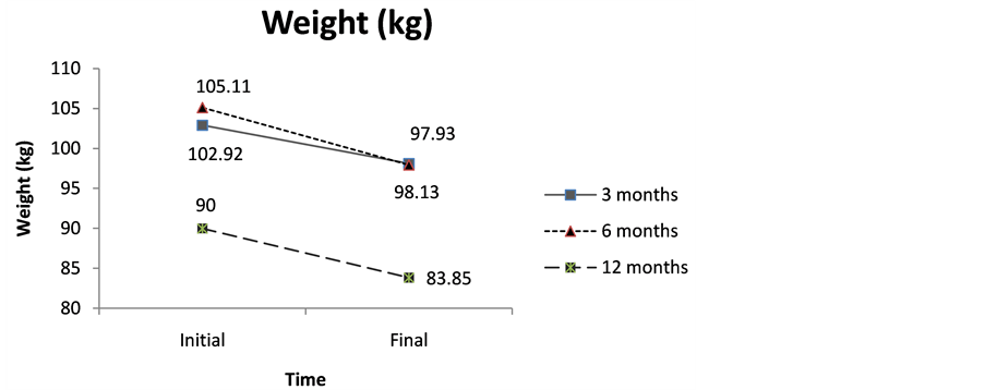 As to the groups undergoing 3, 6, and 12 months of treatment no statistically significant differences were found (p > 0.05) regarding the initial BMI although a decrease tendency in the BMI was noted.