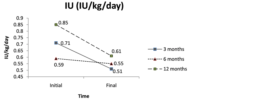 A statistically no significant decrease (p > 0.05) was noticed in weight (F3,26 = 0.457; p = 0.715) as well as in insulin requirements (IU/kg/day) (F3,26 = 0.212; p = 0.887). In both cases, the Duncan Test showed ahomogeneous subgroup, according to the average values presented in Figure 1.