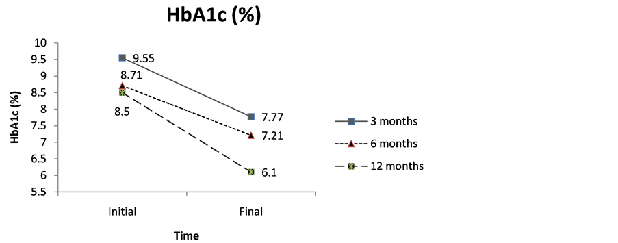 Similarities between this study and the above mentioned are particularly clear in the statistically significant reduction of the levels of HbA1c, being of 1.74% in Buse et al.’ study [33] , in the period of 30 weeks (approximately 7 months and a half), and of 1.78% in the group that underwent a 3 months long treatment, 1.50% in the6 months long treatment, and of 1.70% in the group that underwent a 12 months long treatment, according to our study.