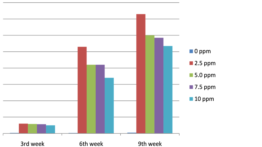 The above results (Figure 2) were clearly reflected in the combined effect of 2,4-D and BA. With 2,4-D alone (0 ppm BA) at 2.5 ppm, the highest weight of callus was obtained which was significantly higher over all other treatment combinations. Other treatment combinations have more or less similar effect at same concentration of both. Results of the study are similar to the findings of Taha [4] from catharanthus internode explants wherein there was an increase of growth of around 125% during the second sub-culture from 0.25 - 1.45 g.