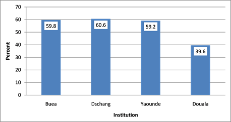 There is a significant variation among the institutions regarding student’s satisfaction with information received before enrollment. Students of the institution in Dschang reported the highest level of satisfaction (76.5%), followed by Yaounde I (70.7%), Buea (68.5%) and Douala (59.1%) (Figure 1).