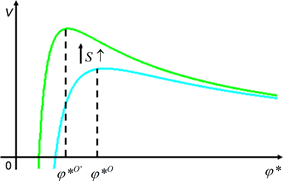 Graphically, Figure 2 shows that an increase in S shifts the one-peaked trajectory to the upper left, to make the optimal cut off level decrease from φ*O to φ*O'. In this figure, blue line is the same as in Figure 1, while green line is depicted by assuming S = 2 with other parameters being the same as in the blue line.