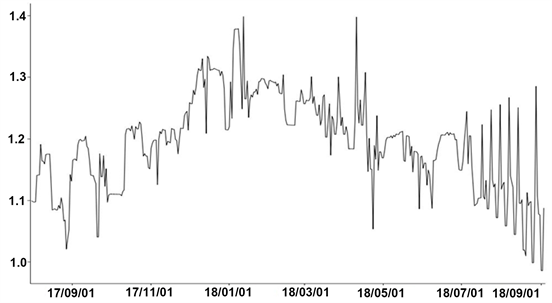 This paper selects China Life’s Jiatian Tiantianying from Tencent Wealth Management Insurance Products as a representative to study the profitability of Internet insurance wealth management products. At the same time, this paper selects the 10,000-yuan income of China Life Jiatian Tiantianying to represent the yield of this product. Through the tracking of the data of the wealth management platform during the research period, a total of 400 data were selected from July 31, 2017 to September 03, 2018. The distribution of the yield of Guoshou Jianian Tiantianying is shown in Figure 1.