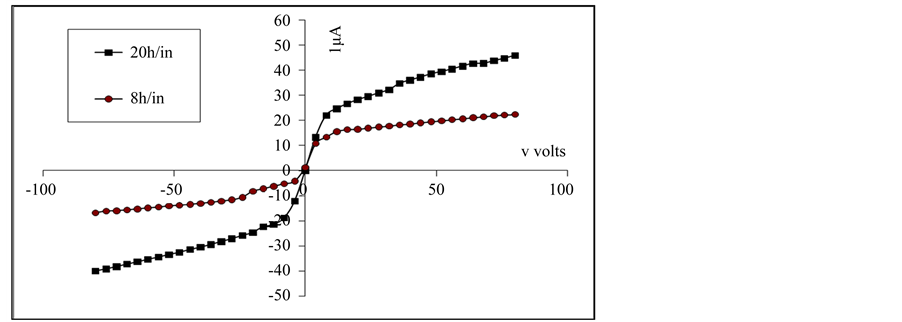 The advantage of using a double probe is that it has a negligible influence on the plasma and it produces reliable temperature and density measurements. Due to the theory of the double probe was discussed before [13] . Figure 5 show the current-voltage (I-V) characteristic curves of typical examples of the double probe for Ar discharge, at axial position 4 mm from the center of cathode (i.e. its parallel to the direction of the electric field lines) for two different perforated aluminum meshes 20 h/in and 8 h/in, at low pressure 0.6 mbar. The figure shows that the ion saturation current of the probe for different perforated aluminum meshes is increased by increasing the number of holes per inch.