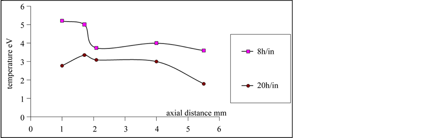 Figure 6 shows the temperature distribution for meshes with 20 h/in, and 8 h/in at axial position 4 mm from the center of cathode mesh at low pressure 0.6 mbar Ar pressure. A sharp axial decrements for electron Temperature (Te), where Te decreased from 5.2 to 3.8 eV for 8 h/in, from 2.75 to 1.8 eV for 20 h/in. Generally the decrements in the electron temperature with faraway axial of the cathode due to the increasing in the sheath length around the mesh wire, moreover temperatures for mesh with 20 h/in is less than those of 8 h/in, may be due to the sheath length (l) around the mesh wires and the space between mesh wires (l) are also critical factors determining the electron temperature in region over the mesh. Roughly, the temperature decreases when the ratio of l to l increases and the temperature becomes minimal when 2l is comparable to l [16] .