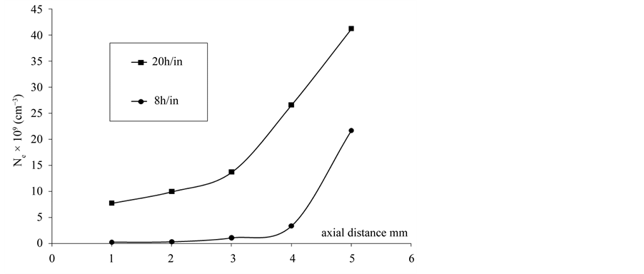 Figure 7 shows that the axial distribution of electron density have a maximum values near the mesh and begin to decrease due to the ion saturation current of the double probe have a maximum value near the mesh and decrease sharply moving faraway the mesh, where the ion density Ni is directly proportional to the ion saturation current. Also the figure show a sharp axial increments for electron density (Ne), whereas Ne increased from 0.9 × 109 to 20 × 109 cm−3 for 8 h/in and 8 × 109 to 42 × 109 cm−3 for 20 h/in. generally the density distribution for mesh with 20 h/in is more than those of 8 h/in may be due to more oxidation and ionization beside the mesh wire for 20 h/in due to the more edges of the holes than 8 h/in.