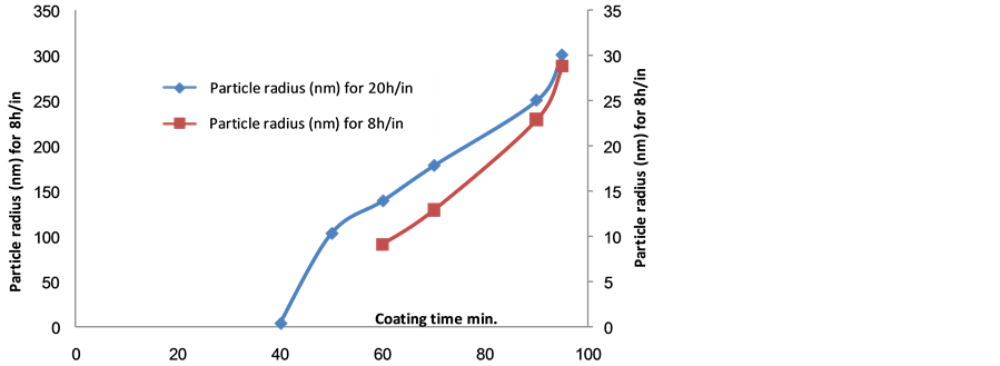 furthermore particles radius (R) for 20 h/in and 8 h/in can be calculated from Table 1. As illustrated in Figure 10 it is clear that particles radius for both type of mesh controllers (20 h/in and 8 h/in) in the range of nanometer and increases with time nodded for coating process, moreover the radius of the particle for 20 h/in about 10 times larger than for 8 h/in, In spite of the starting of the coating process of 8 h/in is faster than that of 20 h/in by 10 minutes. Then the coating process prefers 20 h/in to 8 h/in this may be due to the electron-neutral particles