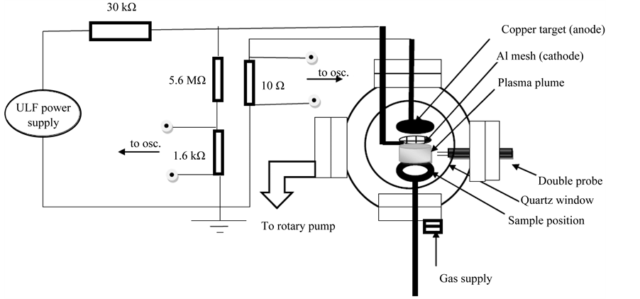 The glow discharge plasma chamber was made of stainless steel with a length of 40 cm and a diameter of 28 cm. This chamber consists of two Co-planar sputtering targets made up of one copper as an anode electrode and different Aluminum meshes as a cathode (power) electrode, and each of them have a diameter of 5 cm. It contained four windows with thickness of about 3 cm and diameter of about 12 cm in different levels, two of them Pyrex glass windows and the two others for the gas in, gas out, the two electrodes and the double probe as shown in Figure 1.