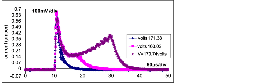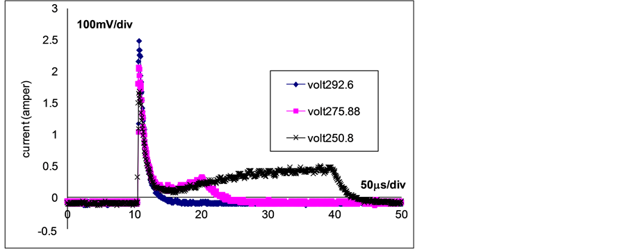 The electrical characteristics of the glow discharge are studied the temporal variation of (ULFP) discharge current [8] at different applied voltages and at low applied pressure (0.6 mbar) for pure argon, where glow discharge is found to be stable only in low-pressure discharge [9] this is because when the pressure is rising, the discharge shifts to sparks and arc and thus, making it impossible to uniformly process an object [10] . The interested regions under investigation are the regions (over the Al mesh) which are the most intense glow zone for studying particle growth process in sputtering discharge. As shown in Figure 3, Figure 4 that the lowest voltage for starting the plasma for perforated aluminum mesh with 20 h/in (small hole width (D) and more space between mesh wires (l)) in the range of 164 volts, but the starting potential for 8 h/in in the range of 251 volts. For both cases the temporal variation of the ULFP discharge current increases with increasing the applied voltage, and increasing for 20 h/in more than for 8 h/in.