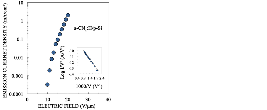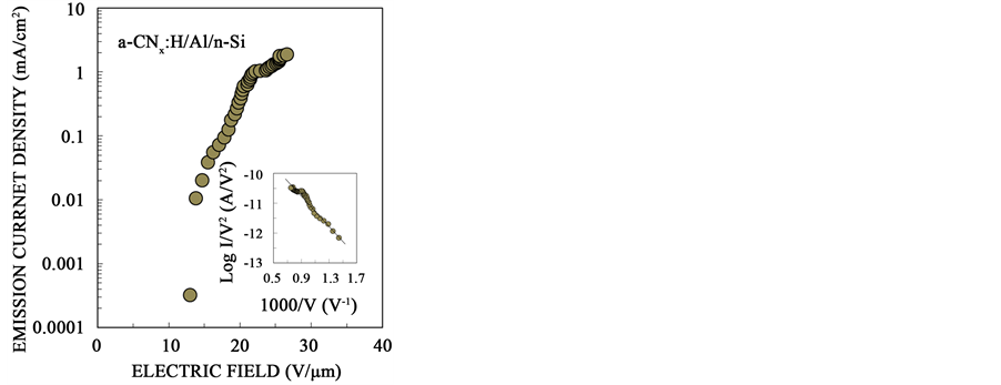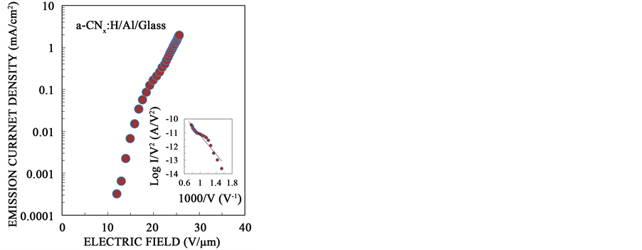 As a reference, an Al/(p- or n-Si or glass) wafer with no a-CNx:H films coating showed no field emissions. This indicates that a-CNx:H film is the key material for easy field electron emission. However, the selection of the base material on which to deposit the a-CNx:H film has a great influence on the ease of field emission. The a-CNx:H film deposited on n-Si showed poor field emission [30] . Al film is a low-cost material compared with Si wafers. Therefore, Al film is important as the base material on which to deposit a-CNx:H film for application to field electron-emission devices.