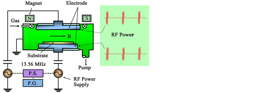 In this experiment, a pulsed rf supermagnetron plasma CVD apparatus (Figure 1) was used to deposit a-CNx:H films. Two different rf power sources with the same rf frequency (13.56 MHz) were used; their rf amplitudes were modulated using a pulse generator (P.G.: 2.5 kHz pulse of 12.5% duty ratio), and the two rf powers were supplied to the two (upper and lower) electrodes inserted into a grounded metal chamber. The upper electrode was covered with a graphite plate to prevent sputtering of the metal electrode surface. The phase difference between the two rf voltages was approximately 180˚ under the control of phase shifter (P.S.: 13.56 MHz oscillator with two out-puts under controlling the phase difference) to obtain the maximum deposition rate, and a rotating magnetic field (approximately 80 G) was applied parallel to the two electrode surfaces. The lower electrode (substrate holder) was heated to 100˚C during film deposition. For film deposition, i-C4H10 (120 sccm) and N2
