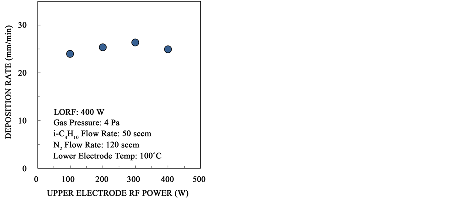 We used a CVD apparatus of pulsed rf supermagnetron plasma under rf power modulated by a 2.5-kHz pulse frequency and a duty ratio (defined as the ratio of pulse on-time to total cycle time) of 12.5% to deposit a-CNx:H films at the gas pressure of 4 Pa. Figure 2 shows the UPRF (100 - 400 W) dependence of the film deposition rate on Si wafer measured at an LORF of 400 W, whose deposition rate showed slight dependence on substrate (Si or SiO2). The deposition rate changed slightly, and was about 25 nm/min, reaching a peak (26.3 nm/min) at the UPRF of 300 W. During the off-time of the LORF, the wafer temperature became naturally lower than that of the wafer exposed to continuous discharge plasma [25] [26] .