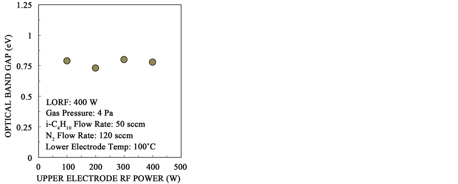 The optical band gaps of a-CNx:H films formed on SiO2 substrates at UPRF/LORF levels in the range 100 - 400/400 W were measured; results are shown in Figure 3. The optical band gap changed little, and was about 0.75 eV for all trials. From this experiment, it was found that the optical band gap depended very little on the UPRF.