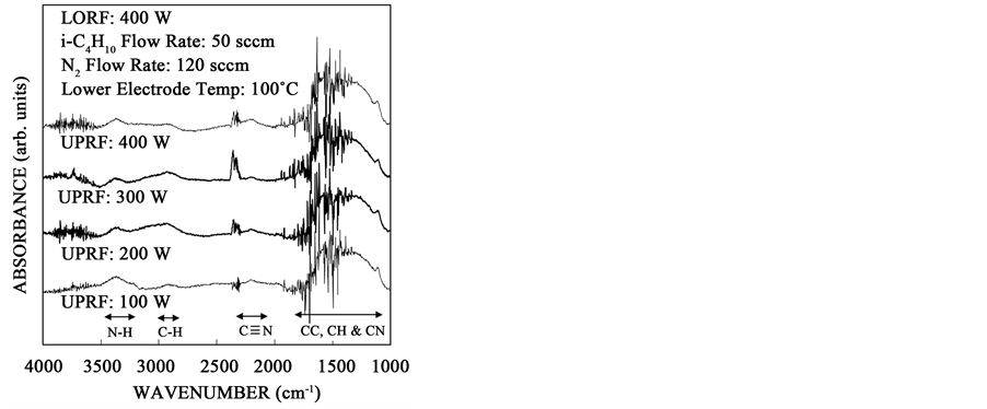 FTIR absorption spectra were measured for the a-CNx:H films deposited on Si wafers at UPRF/LORF levels of 100 - 400/400 W, and are shown in Figure 5. Four kinds of absorption spectra were measured at 1100 to 1700 cm−1 (C=C, C=N, and C=N-H bonds), 2190 cm−1 (C≡N bond), 3030 cm−1 (CH3, CH2, and CH bonds) and 3300 cm−1 (NH bonds) [28] . Absorption spectra changed very little with the increase of UPRF from 100 W to 400 W, as with the case of optical band gap shown in Figure 3.