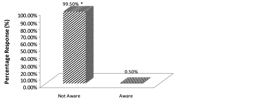 Figure 6 shows that significant number of those who are G6PD deficient did not have the knowledge that the presence of another disease could exacerbate their haemolytic crisis. The represented 99.5% and very significant compared to those who were aware (p < 0.05).