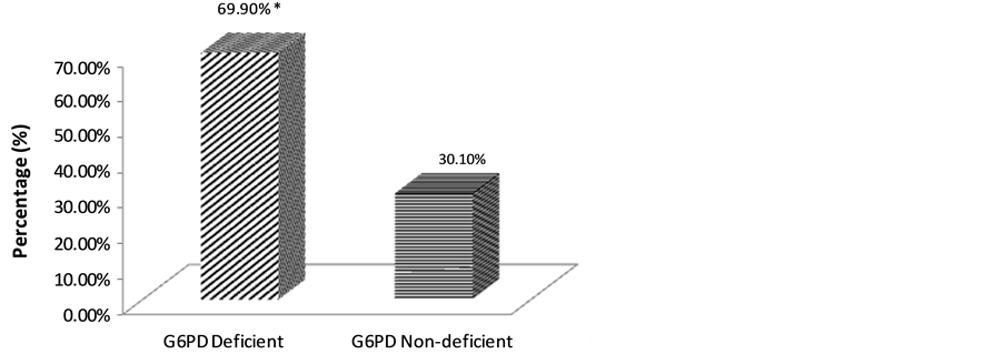 Figure 2. Showing distribution pattern of G6PD deficiency syndrome amongst the sampled population. *(p < 0.05); G6PD = Glocose-6-phosphate dehydrogenase deficiency.
