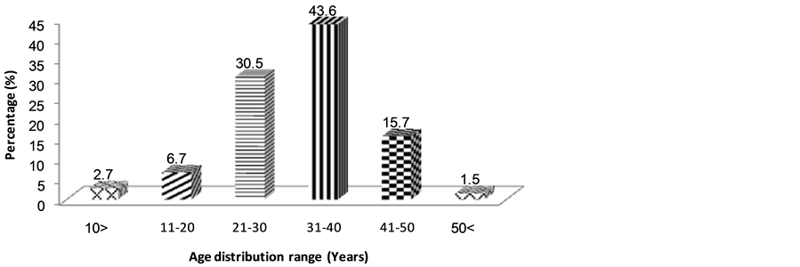 Age distribution of respondents display a well sampled questionnaire, which ranged from <10 to >50 years. Majority of the respondents fell under the age group of 31 - 41 years, representing 40.1% out the total number interviewed (Table 1). This group also represented the working class as they are all gainfully employed.