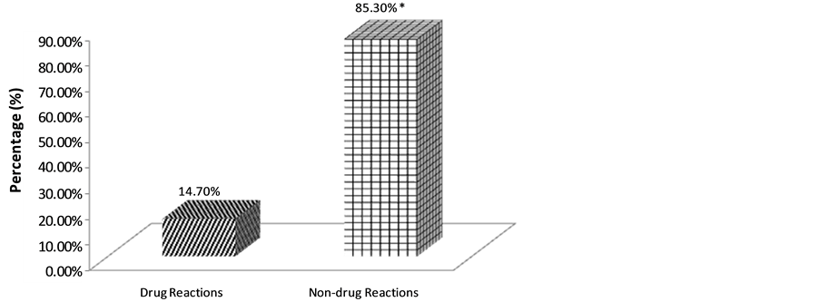 Figure 4. Drug and non-drug reactions distribution amongst G6PD deficient subjects sampled. *(p < 0.05).