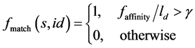 , Equation (1) represents how to identify immature detector id by s, where 1/0 represents whether id match with s or not, ld is the length of detector id, faffinity is used for calculating affinity between s and id,