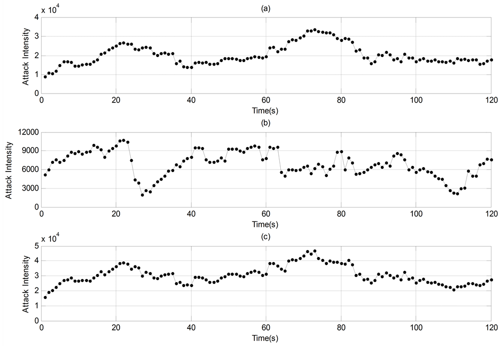 Figure 2. (a) Spoof attack intensity for the WWW service of device/node, (b) Sinkhole attack intensity for the FTP service of device/node, (c) Overall attack intensity that the IOT suffered.