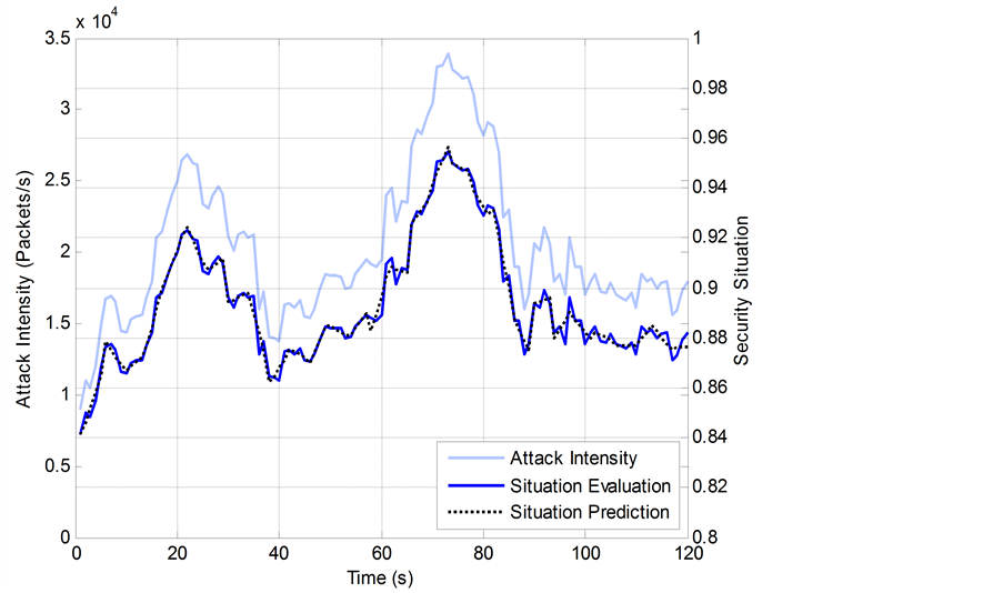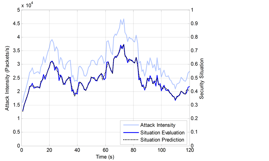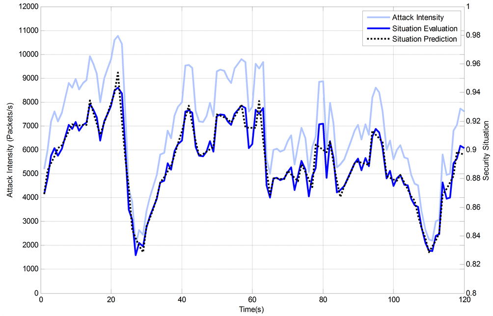 IOT environment suffered, the curves of the corresponding attack intensity, situation evaluation and situation prediction are given in Figure 5.