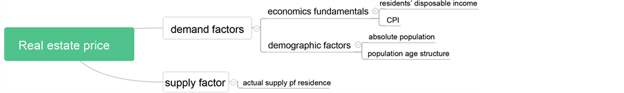Many factors can affect the real estate price. While real estate is commodity essentially, according to the price decision mechanism of commodity, we divide influencing factors into demand factors and supply factors. In terms of demand side, we consider the economic fundamentals and demographic factors. For economic fundamentals, we mainly consider the residents’ disposable income as well as CPI, this is because the housing demand is both consumption and investment, no matter from which aspect, disposable income will increase the demand of commodity housing. For demographic factors, besides considering the absolute population of each region, the population age structure is the main variable, and supply factors, we mainly consider the actual supply of residence. Factors that affect real estate price are shown in Figure 1.