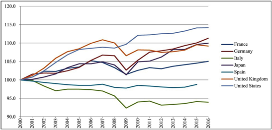 From 2009 onwards, the situation ceases to be homogeneous. Germany and Japan show a considerable increase in capital productivity, which substantially returns to the levels prior to the international crisis. The USA and the United Kingdom stabilize after the 2007-2009 setback. Spain shows a continuous and striking decrease in capital productivity (data are available until 2015) and this decrease is likewise recorded in France, albeit to a much lesser extent. As for Italy, there is a constant, marked drop in capital productivity until 2013, although there is a modest recovery in the last three years considered.