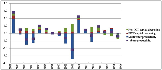 Figure 9. Italy, percentage point contribution to labor productivity growth, annual, 2000-2016. Source: authors’ elaborations on OECD Stat data.