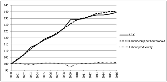 Figure 1. Unit Labor Costs Index (average cost of labor per unit of output, 2000-2016). Souce: authors’ elaborations on OECD data.