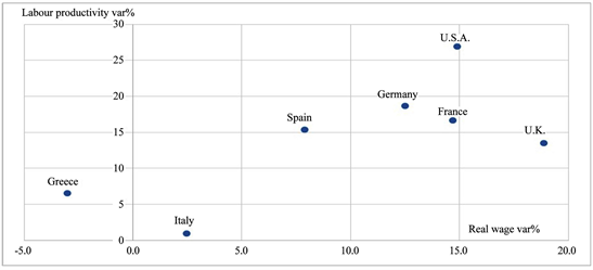 A similar slight decline in real wages can be observed both in the United Kingdom and, just more marked, in Italy. Peculiar and unusual is the case of France, but above all of Germany and the USA: in these countries, despite the international crisis, real wages are continuing to grow together with a strong increase in labor productivity. This shows that where labor productivity grows intensely and continuously, the economic crisis has no impact on real wages, which already tend to be rigid downwards. Real wages are thus proving to be a structural rather than a cyclical variable.