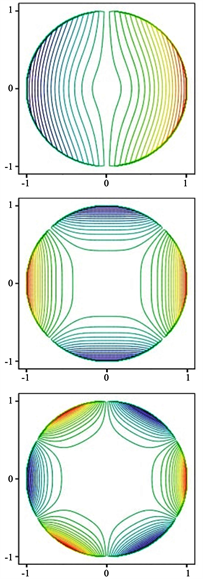 Contour plots of the multipole basis functions are shown in Figure 1. The number of lobes is 2 m, with half of them positive and half negative, and higher m values have the lobes more concentrated toward the outer radius. Thus, the multipole analysis is more sensitive to structure near the outer radius than near the center. The corresponding basis functions are the same but rotated counter-clockwise by 90˚/m, i.e. by half the size of one lobe.