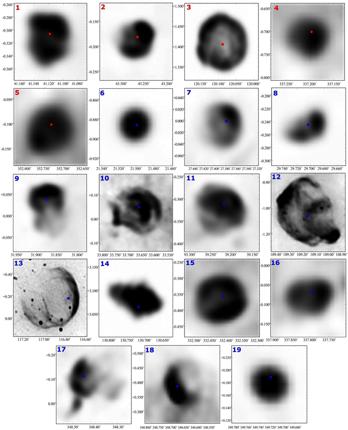 Figure 2. 1420 MHz continuum images of SNRs. Red and Blue numbers denote Ia and CC type SNRs respectively and the dots denote the centroid of the SNR.
