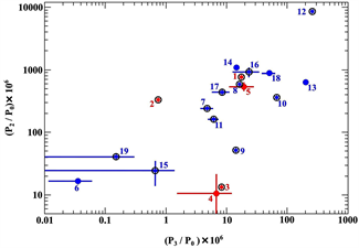 Figure 3. Power ratios, P2/P0 and P3/P0 of type-known Galactic SNRs. The red and blue denote Type Ia SNRs and CC SNRs, respectively. The star symbols with black circles denote SNRs with molecular cloud associations.