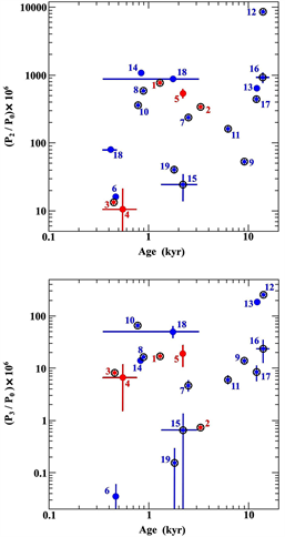 Figure 4. Power ratios versus ages of the type-known SNRs. The red and blue denote Type Ia SNRs and CC SNRs, respectively. The star symbols with black circles denote SNRs with molecular cloud associations.