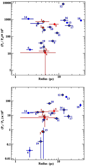 Figure 5. Power ratios versus radii of the type-known SNRs. The red and blue denote Type Ia SNRs and CC SNRs, respectively. The star symbols with black circles denote SNRs with molecular cloud associations.