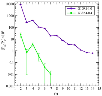 Figure 6. Higher orders power ratios of SNRs G109.1-1:0 and G332.4-0.4. Errors on the power ratios are shown by the vertical lines with bar ends.
