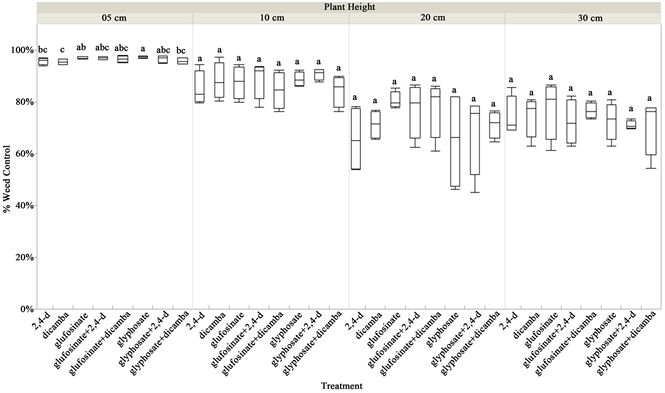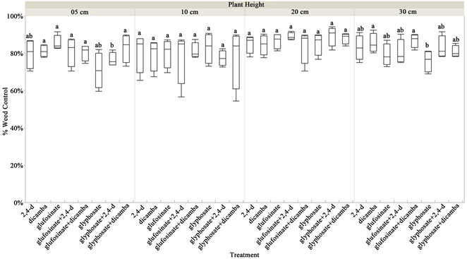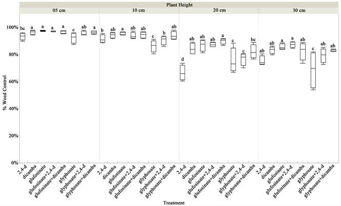 Figure 6. Sicklepod percent control at various heights as affected by selected herbicide treatments in trial 2. Boxplots within the same plant height not connected by the same letter (s) are significantly different according to the Student’s t-test (p = 0.05).