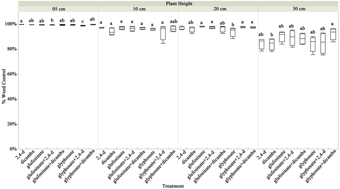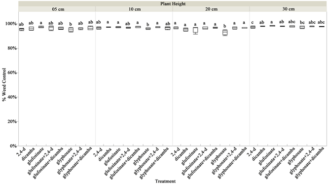 Figure 3. Palmer amaranth percent control at various heights as affected by selected herbicide treatments in trial 1. Boxplots within the same plant height not connected by the same letter (s) are significantly different according to the Student’s t-test (p = 0.05).
